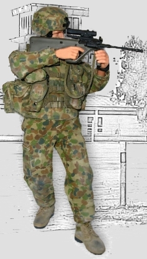 Tropas de antigos países da INTERFET (International Force East Timor, que atuou no país em 1999-2000, da qual o Brasil fez parte) apoiaram a força australiana. Além da Austrália, as forças da Nova Zelândia e, por um tempo, do Exército Malaio começaram a chegar por via aérea em 26 de maio, e em seguida as de Portugal. Inicialmente, mais de 3.000 soldados foram destacados, mas depois que as Nações Unidas enviaram uma missão policial internacional no final de agosto de 2006 e a situação se acalmou, o número de tropas foi reduzido. As Forças de Segurança de Timor-Leste (ISF) e a UNMIT agora mantinham conjuntamente a lei e a ordem e ajudavam a reconstruir as forças de segurança timorenses. Uma tarefa importante de ambas era também garantir que as eleições presidenciais e parlamentares de 2007 transcorressem de forma razoavelmente pacífica. A Austrália, no entanto, insistiu que as ISF permanecessem sob sua liderança e não sob a liderança da ONU. A tentativa de capturar o líder fugitivo dos soldados rebeldes, Alfredo Reinado, em um cerco à cidade de Same fracassou, apesar do envio de uma força especial australiana e helicópteros. Reinado foi posteriormente morto em um atentado para assassinar a liderança timorense em 11 de fevereiro de 2008. Em fevereiro de 2008, após o ataque, a Austrália inicialmente aumentou suas tropas de 800 para 1.000. O país forneceu soldados do Grupo de Batalha ANZAC do 1º Batalhão do Regimento Real Australiano, de Townsville. Além disso, haviam unidades da Aviação do Exército, Logística e Polícia Militar. Em outubro de 2009, o contingente australiano havia sido reduzido para 650 homens. A Nova Zelândia participava com 155 soldados e dois helicópteros UH-1 Iroquois. Em 2010, a força foi reduzida para 400 soldados australianos e 75 neozelandeses. O movimento rebelde entrou em colapso nas semanas seguintes. As tropas foram gradualmente reduzidas devido ao progresso alcançado na estabilização do país, e foi decidido retirar as forças de segurança estrangeiras após as eleições presidenciais e parlamentares de 2012. O uniforme do soldado aqui representado está no padrão de camuflagem "Auscam" em 5 tons, que desde 2016 está sendo substituído pelo "AMP" Australian Multicam Pattern, com basicamente as mesmas cores, porém em padronagem parecida com a Multicam das Forças Americanas. O capacete é do modelo RBH 303AU em kevlar e aramida, de desenho israelense mas customizado para as Forças de Defesa Australianas (ADF), a partir de 2015 substituído pelo modelo TCH, que oferece proteção contra traumas balísticos, de fragmentação e de força contundente (impacto), além de suportes e trilhos para acessórios. O formato e o design do TCH permitem máxima consciência sensorial e situacional para o operador. O colete balístico Sistema de Blindagem Corporal em Camadas (TBAS) é otimizado para proteção e mobilidade. O projeto inclui componentes adicionais escaláveis que permitem aos usuários aumentar rapidamente os níveis de proteção de acordo com o ambiente operacional. O cinto modular com correias/arnês para transporte de carga permite o transporte independente de cargas de combate mais leves, e neste caso nosso soldado carrega munição extra e um kit de primeiros-socorros. A bandoleira permite que o usuário empunhe uma arma de forma que lhe permita usar ambas as mãos livremente para as tarefas necessárias. A mochila de assalto está disponível em vários tamanhos para fornecer ao usuário a capacidade de transportar itens essenciais para a missão. Suas armas pessoais são o fuzil de assalto EF88 Austeyr, calibre 5.56 mm, fabricado localmente pela Thales Austrália sob licença da empresa austríaca Steyr, a pistola semi-automática Browning Hi-Power, calibre 9 mm, e faca de combate modelo M9, também adaptável como baioneta para o fuzil. |